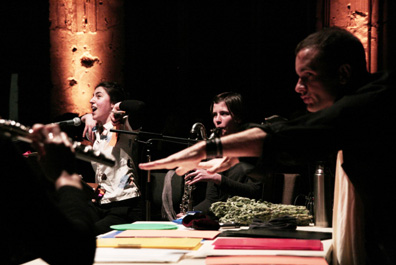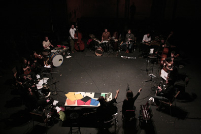 Cobra is a complex group improvisation game language conceived by John Zorn in— but not of!— music; which is absolutely fun, mind-bending, physical, addictive, often psychodramatically provocative, and forever changes the way one thinks about the potentialities of group improvisation. It is normally executed by 10-14 diverse players of any stylistic background and one prompter— a director at a table of colored cards relaying requests from the players, as well as overseeing the group and instigating ideas which could only come from that omniscient perspective. I played in it with Zorn in New York and have since directed it myself hundreds of times. Over this time I have developed it further into more diverse & refined energetic and social dimensions— working interdisciplinarily and integrating influence from my research & work with languages of synergy & ritual in Africa, from improvisation practices in dance & theater, and the physicality of the language of conducting, which is my background. And after it all, had codified my own gesture system for directing improvisation.