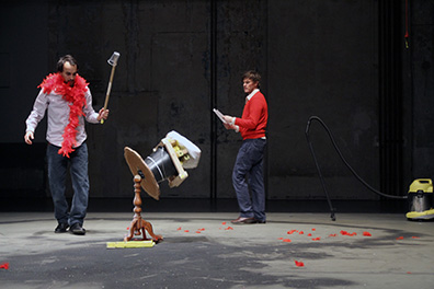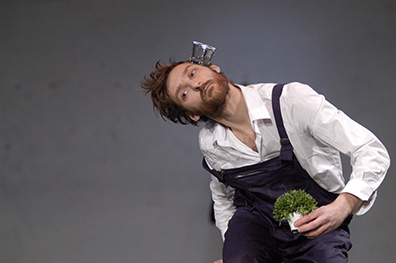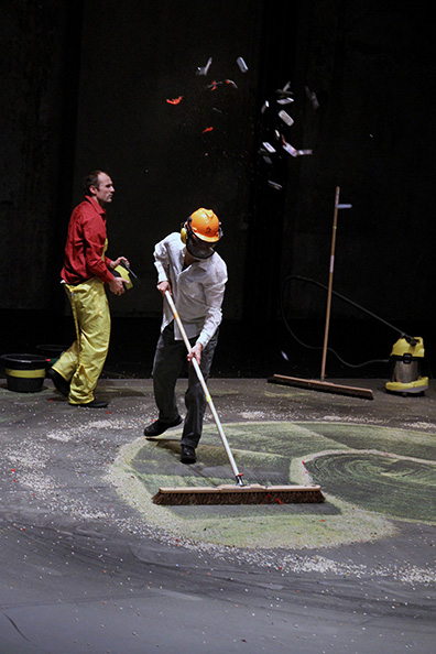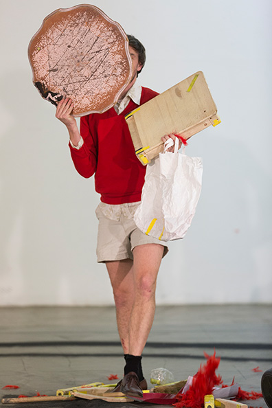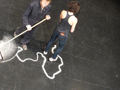 Objects, things in front of us, behind us, above us, under, inside, their presence defines us, making our knees bend to climb, making our arms stretch to catch, our back curve to focus, our jaw close to bite. The stairs, the glass, the book, the apple, those simple elements of our daily life define us as much as we define them. This elementary dialogue: the object I choose, the way it makes me move, will be our ground, the point zero of our study of performance. In this primary relation that we all experience on a daily basis, lies a complex and diverse system of organization, ideas, thoughts and prejudices. Hidden behind these simple things are huge manufactories, workers, marketing strategies, technological devises, visions, and the entire human choreography is there waiting to be acknowledged. How to perform on a stage with those companions and their implications?